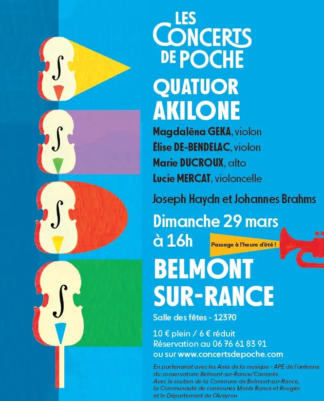 Les Concerts de Poche en partenariat avec les Amis de la Musique – Antenne de Belmont et Camarès vous convient à un nouveau concert à la salle des fêtes avec le Quatuor Akilone